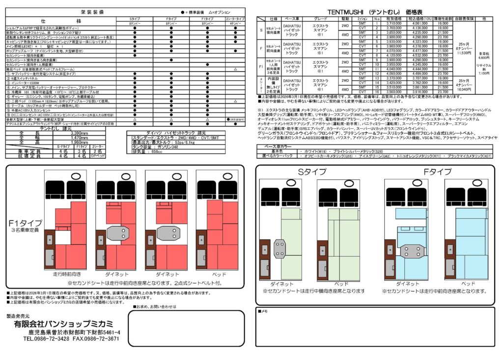| 乗車定員/就寝定員 | 4名/4名 ※F1タイプは3名定員となります。 |
